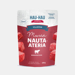 - Lihaisa ja maistuva ateriaHau-Hau Champion Viljaton murea nauta-ateria ei nimensä mukaisesti sisällä lainkaan viljaa. Se on myös monoproteiininen eli sisältää vain yhtä eläinproteiinin lähdettä. Nauta on tuttu ja erittäin proteiinirikas raaka-aine, joka sisältää muun muassa koirasi elimistölle tärkeitä aminohappoja. Yhden lihan ateria on helppo valinta myös herkkävatsaiselle tai eliminaatiodieetillä olevalle koiralle, jolle kaikki proteiininlähteet eivät sovi. Viljattomuuden lisäksi patee on täysin soijaton ja sokeroimaton, eikä sen valmistuksessa ole käytetty keinotekoisia väri- tai makuaineita. Lue lisää herkkävatsaisen koiran ruokinnasta.Tällä herkullisen murealla aterialla voit kätevästi tuoda lisää maistuvuutta ja monipuolisuutta koirasi päivittäisiin ruokahetkiin, sillä maistuva ja monipuolinen ruoka on jokakoiranoikeus. Viljattomien annosaterioiden sarjasta löytyy varmasti suosikkimaut kaikkien makuun. Yhden lihan aterioista voit valita koirallesi nauta-aterian lisäksi myös maalaiskana- tai Itämeren kalat -aterian. Olemme tehneet oman märkäruoan myös pennuille. Lue lisää.Kätevä pakkaus mukaan reissuunAnnosateria on pakattu kätevään 150 gramman pussiin, joka on helppo napata mukaan vaikkapa matkalle tai harrastusten lomassa nautittavaksi. Tämä lihaisa täysravinto sopii koirallesi maittavaksi ateriaksi joko sellaisenaan tai tarjoiltuna Hau-Haun nappuloiden ohessa. Vaihtelevat ateriat tukevat koirasi suoliston hyvinvointia ja monipuolistavat purutuntumaa.Luotettavasti omalta tehtaaltammeViljattomat annosateriat on valmistettu Hau-Haun omalla tehtaalla Virossa, ja niiden raaka-aineet tulevat Euroopasta. Tuoreesta lihasta valmistetut Hau-Hau Champion märkäruoat kypsennetään pakkauksessaan, minkä ansiosta raaka-aineiden ravintoaineet eivät mene hukkaan ja avaamaton pakkaus säilyy huoneenlämmössä.Lue lisää Hau-Haun tuotteiden valmistus- ja alkuperämaista. Voit testata koirallesi Hau-Haun tuotteita vaivatta, sillä tarjoamme kaikille tuotteillemme tyytyväisyystakuun.