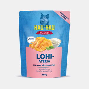 Hau-Hau Champion Lohiateria on märkäruoka, jolla saa lisättyä monipuolisuutta ja maistuvuutta nirsonkin koiran ruokavalioon. Tarjoillaan sellaisenaan tai muun ruoan joukossa.
