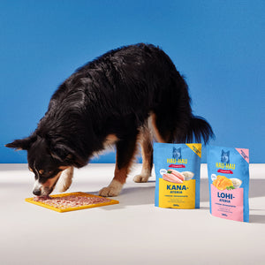 Monipuolinen ruoka pentuiästä lähtien on hyväksi koiran suolistomikrobeille ja saattaa ehkäistä ruoka-aineyliherkkyyksien sekä allergioiden syntymistä. Siksi voit monipuolistaa tällä märkäruoalla myös pentukoirasi ruokavaliota pennuille suunnitellun täysravinnon ohessa korvaamalla esimerkiksi 30 % penturuoasta Lohiaterialla. Kala on erinomainen lisä koiran ruokavalioon, sillä kalasta koira saa luontaisesti D-vitamiinia ja hyviä rasvahappoja. Onko koirasi ylipainoinen ja tarvitsee tukea painonhallintaan? Märkäruoan ottaminen osaksi koiran päivittäistä ateriaa voi lisätä koiran kylläisyyden tunnetta ja auttaa näin painonhallinnassa. Lue lisää koiranruoan monipuolistamisesta ja sen hyödyistä.