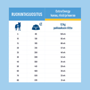 Etsitkö kotimaista kuivaruokaa, jossa on runsaasti eläinperäistä proteiinia ja rasvaa aktiivisen koiran tarpeisiin? Hau-Hau Champion Extra Energy on vehnätön ja maissiton koiranruoka, joka sisältää 40 % siipikarjaa, 20 % rasvaa ja kaikkiaan 32 % proteiinia, josta jopa 90 % on eläinperäistä. Kotimainen kana on tämän koiranruoan ensisijainen eläinproteiinin ja -rasvan lähde. Raaka-aineen saatavuuden mukaan ruoka saattaa sisältää kanan lisäksi vatsaystävällistä, kotimaista kalkkunaa. Pohjolan pelloilla viljelty kaura ja huolellisesti kypsennetty, pehmeä eurooppalainen riisi hellivät koirasi vatsaa.