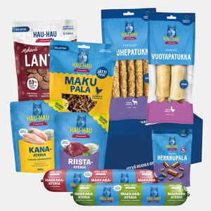 Tuotepaketti sisältää samoja tuotteita, joita Koti Koiralle -ohjelmassa uutta kotiaan etsivät koirat saavat mukaansa uuteen kotiinsa. Näin voit tarjota omalle koirallesi samat maistuvat eväät kuin ohjelman hurmaaville tv-tähdille. Hau-Haun herkkujen lisäksi paketin mukana tulee lämmin korttitervehdys ohjelmastakin tutuilta koirankouluttaja Tommy Wiréniltä ja hänen koiraltaan Sorryltä. Tämä tekee paketista entistäkin erityisemmän ja tuo hymyn huulille!