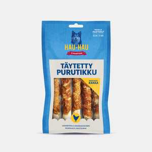 - Maukasta kanaa kääreenä ja täytteenäHau-Hau Champion Täytetty purutikku on tuplasti herkullinen puruluu koirakaverillesi! Kanafileeseen käärityn naudannahkaluun sisällä on herkullinen kananmaksatäyte. Puruluiden pureskelu koiralle lajityypillistä tekemistä, joka myös auttaa pitämään huolta koirasi hampaista. Kaksi kokoa isoille ja pienille koirille.Hau-Hau Championin lihaa sisältävät puruluut ovat kevyitä ja herkullisia virikeluita, jotka tarjoavat koirallesi puuhakkaan hetken ja mekaanista hampaidenpuhdistusta. Fileillä kuorrutetut puruluut maistuvat nirsollekin koiralle. Purutikun kääreenä olevat kanafileet ovat kuivattua lihaa. Pidäthän siis huolen, että koirallasi on aina raikasta vettä saatavilla. Täytetyt purutikut sisältävät runsaasti proteiinia, joten tarjoa niitä koiralle kohtuudella. Valvo aina koiraasi sen syödessä puruluita.Hau-Haun valikoimasta löydät puruluun jokaiselle puruvoimalleKaluaako koirasi puruluut nopeasti vai sopiiko koirallesi kenties hennommat rouhepatukat? Valikoimastamme löydät varmasti koirallesi sopivan puruluun. Tutustu tuoksuviin ja maistuviin Kunnon puruluihin, perinteisiin naudannahkaisiin puruluihin tai lihaa sisältävien herkkuluiden valikoimaan.Lue lisää Hau-Haun tuotteiden valmistus- ja alkuperämaista. Voit testata koirallesi Hau-Haun tuotteita vaivatta, sillä tarjoamme kaikille tuotteillemme tyytyväisyystakuun.