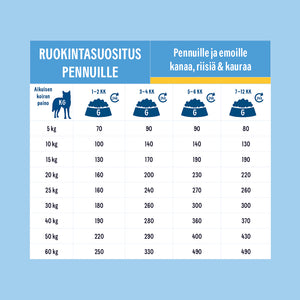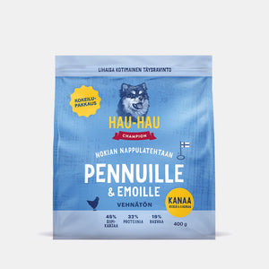 -  400 g kokeilupakkaus kotimaisesta koiranpennun kuivaruoastaHau-Hau Champion Kanaa, riisiä & kauraa pennuille ja emoille on kotimainen koiran kuivaruoka, joka on suunniteltu kasvavan koiranpennun sekä tiineen nartun ja imettävän emon erityistarpeisiin. Nyt saat maistuvan, lihapitoisen ja terveellisen ruoan 400 g kokeilupakkauksessa, jolla testaat ruoan maistuvuutta ja sopivuutta koirallesi. Tämä kotimainen kuivaruoka sisältää kaikki koiranpentusi tarvitsemat ravintoaineet tasapainoisessa suhteessa ja auttaa emoa ravitsemaan pentujaan sekä tukemaan niiden kehitystä jo sikiövaiheesta lähtien. Nappulankoko on pieni, jotta se sopii hyvin pennun pureskeltavaksi. Hau-Haun penturuoka on saanut avainlippumerkin, ja sen kotimaisuusaste on jopa 81 %.Runsaasti energiaa sitä tarvitsevilleNartun oikeanlainen ruokinta tiineys- ja imetysaikana auttaa antamaan pennuille vahvan alun elämään. Tiine narttu, imettävä emo ja kasvava pentu tarvitsevat runsaasti energiaa, minkä vuoksi tämä täysravinto sisältää 45 % siipikarjaa, 19 % rasvaa ja kaikkiaan 32 % proteiinia, josta 85 % on eläinperäistä. Kotimainen siipikarja on Hau-Haun penturuoan ensisijainen eläinproteiinin ja -rasvan lähde, eikä ruoka sisällä lainkaan kalaa. Raaka-aineen saatavuuden mukaan ruoka saattaa sisältää kanan lisäksi vatsaystävällistä, kotimaista kalkkunaa.Koiranpentusi saa kanasta välttämättömiä aminohappoja elimistön rakennusaineiksi ja tukemaan tervettä kasvua. Kalsiumin ja fosforin ihanteellinen suhde sekä huolellisesti optimoitu ravintoainekoostumus tukevat koiranpennun luuston normaalia kehitystä. Kuitujen ja hiilihydraattien lähteinä kuivaruoassa on kotimaista kauraa ja huolellisesti kypsennettyä, pehmeää eurooppalaista riisiä, jotka tekevät hyvää pennun vatsalle. Koiranpennun kehittyvä, herkkä suolisto hyötyy koiranruoan sisältämistä luonnollisista MOS- ja FOS-prebiooteista, jotka edesauttavat hyvien suolistobakteerien kasvua.Tukea kasvuun hyvistä rasvahapoistaPentu jaksaa leikkiä ja tutkia maailmaa, kun sillä on vahva sydän ja toimiva hermosto. Siksi olemme lisänneet tähän penturuokaan suomalaista camelinaöljyä varmistamaan tärkeiden omega-3- ja omega-6-rasvahappojen saannin. Nämä välttämättömät rasvahapot tukevat muun muassa sydämen ja hermoston toimintaa, auttavat ylläpitämään hyväkuntoista turkkia ja ihoa sekä edistävät nivelten terveyttä. Turkkia ravitsevat myös lisätty sinkki ja biotiini, joka lisäksi auttaa vahvistamaan koiran kynsiä.Minkä ikäiselle koiralle Hau-Haun penturuoka sopii?Tarjoa maistuvaa Hau-Hau Champion Kanaa, riisiä & kauraa pennuille ja emoille -täysravintoa nartulle tiineyden viimeisestä kolmanneksesta aina imetyksen loppuun saakka. Tämä vehnätön koiranruoka sopii pentusi ravinnoksi yhden kuukauden ikäisestä alkaen noin vuoden vanhaksi asti, minkä jälkeen ruoan voi vaihtaa asteittain aikuisen koiran kuivaruokaan. Katso ruokintataulukko täältä.Läheltä ja lihaisaaHau-Hau Champion Kanaa, riisiä & kauraa pennuille ja emoille -kuivaruoka on saatavilla kokeilupakkauksen lisäksi 1,5 kg ja 12 kg pakkauksissa. Valmistamme Hau-Haun penturuoan Nokian nappulatehtaallamme Pirkanmaalla. Koiranruokiemme ensiluokkaisen laadun takaavat suomalainen huippuluokan tuotekehitys ja vuosikymmenten aikana karttunut vankka ammattitaito. Käytämme Suomessa valmistetuissa koiranruoissamme mahdollisimman paljon kotimaisia raaka-aineita. Tutustu tarkemmin Nokian Nappulatehtaaseen.